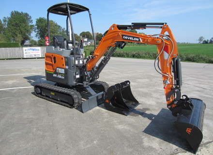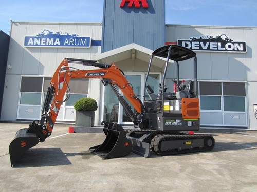 Eigen gewicht ±1995kg. Develon Battery Pack: nominal Voltage: 51,6V, capacity: 20,4kWh (26,8 hp), On-Board Charger: Power Output 3.3kW (220V AC, 16A), laadtijd 100% 6h, hydr. pompopbrengst 2x17.6 ltr.