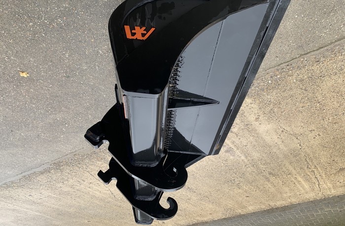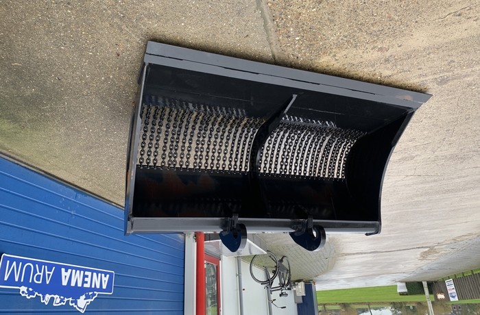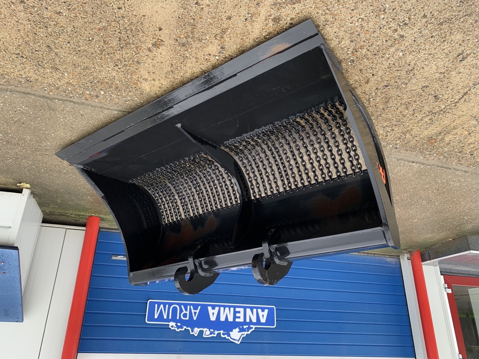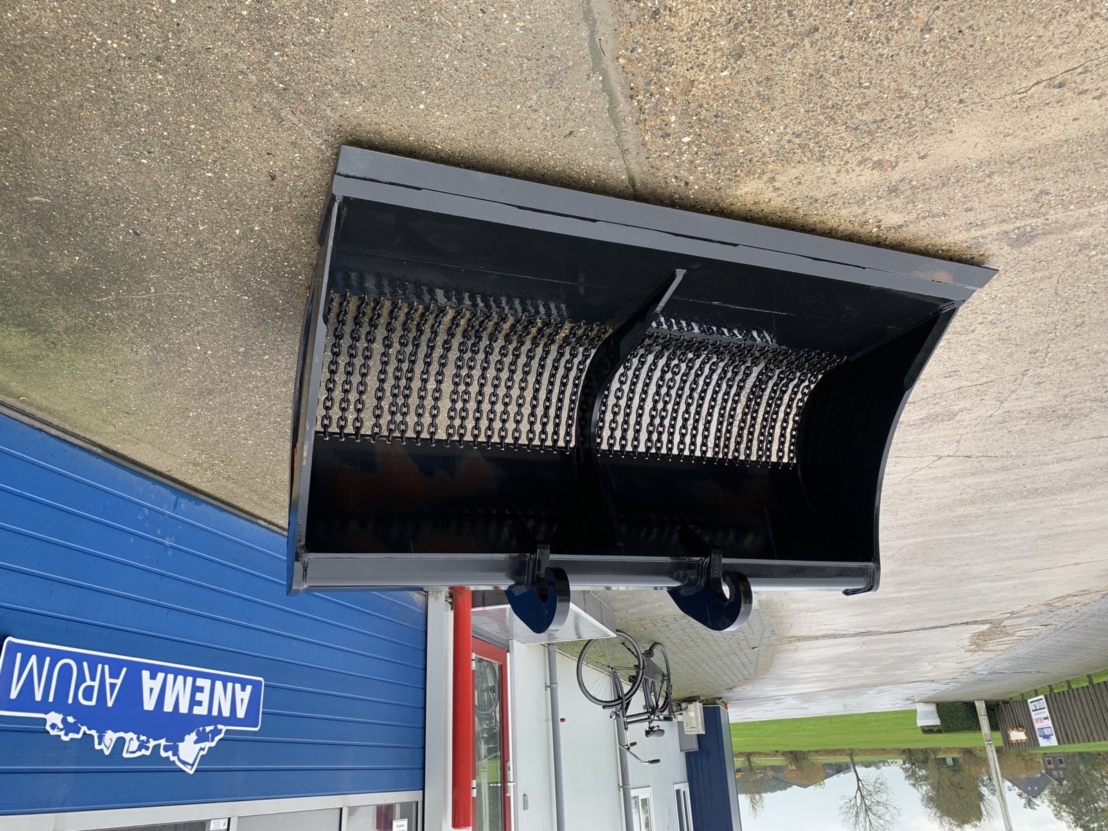 Eigen gewicht ±650kg, breedte 200cm, inhoud ±1250ltr. 1:1, met gehard hijsketting, machineklasse 16-21ton, ophanging CW30. Incl. voorzetmes. Ook te huur!