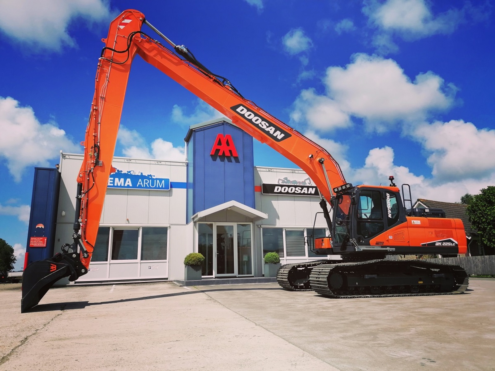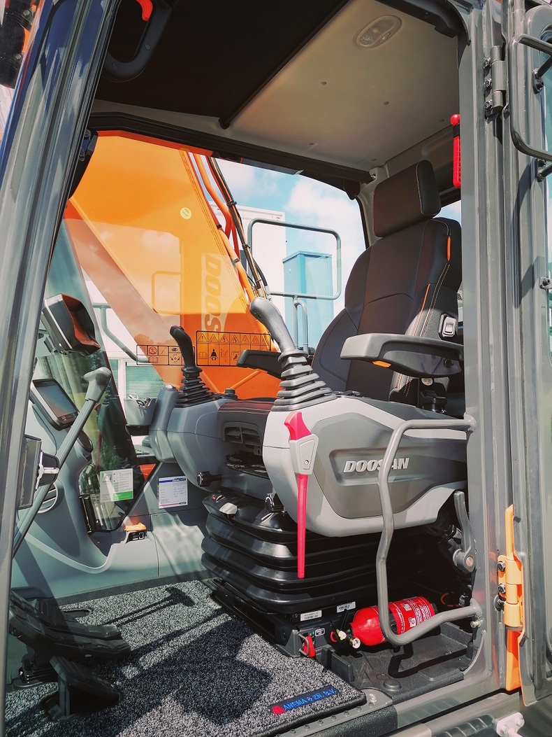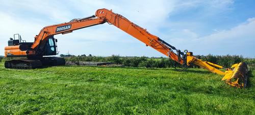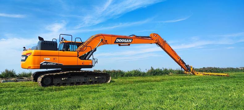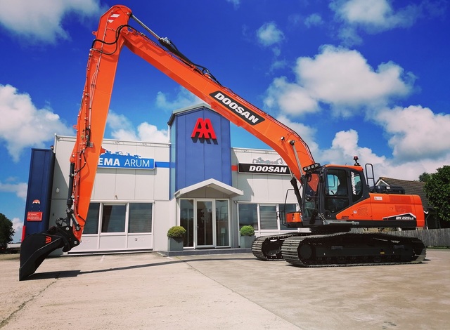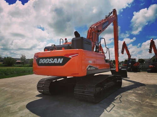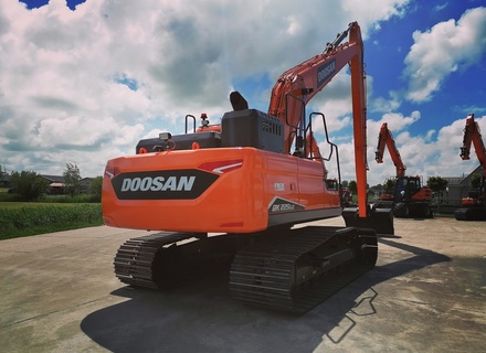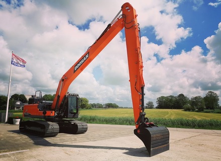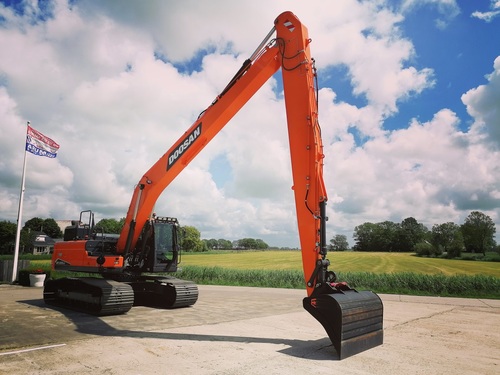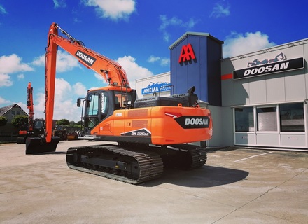 Eigen gewicht ±24000kg, monogiek 850cm, steel 620cm (bereik ±16mtr.), extra ballast ±2500kg, hydr. snelwissel CW30, AA brede slotenbak 180-1000ltr., rotatiefunctie, proportionele bediening, brede rupsen 90cm, extra LED-werkverlichting, Doosan DL06 6-cilinder commonrail dieselmotor Tier V. Nieuwste cabine met instelbare & luchtgeveerde stoel incl. verwarming, climate control, 360gr. camera, DoosanConnect, automatische centrale vetsmering Groeneveld, treeplank. Ook te huur!