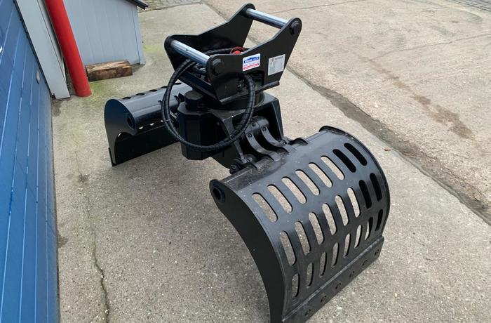 Eigen gewicht 400kg, machineklasse 5-9ton, ophanging CW1, hydr. rotatie, schaalbreedte 70cm, spreidopening 150cm, inhoud 200ltr. Incl. wisselmessen, slangen en koppelingen.