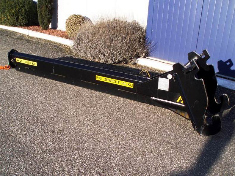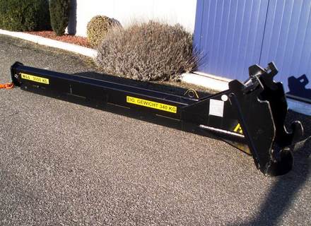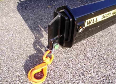 Hijsarm mechanisch uitschuifbaar van 300cm naar 500cm, hefvermogen 3ton op 300cm en 800kg op 500cm, ophanging CW30 of S60, eigen gewicht ±340kg, hijshaak incl. keuringscertificaat. Ook te huur!