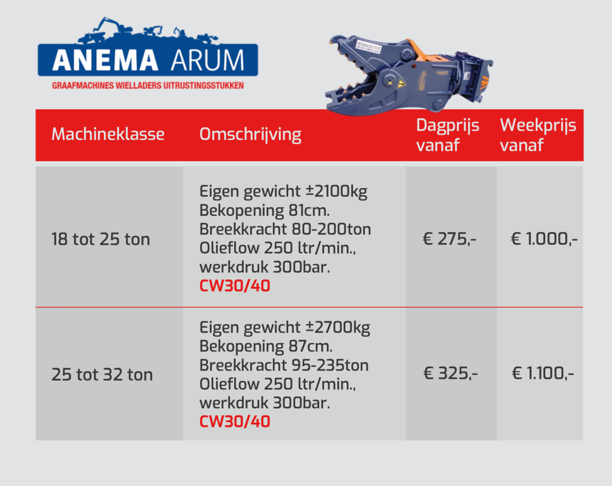 | 18 tot 25 ton | Eigen gewicht ±2100kg Bekopening 81cm. Breekkracht 80-200ton Olieflow 250 ltr/min., werkdruk 300bar. CW30/40 |