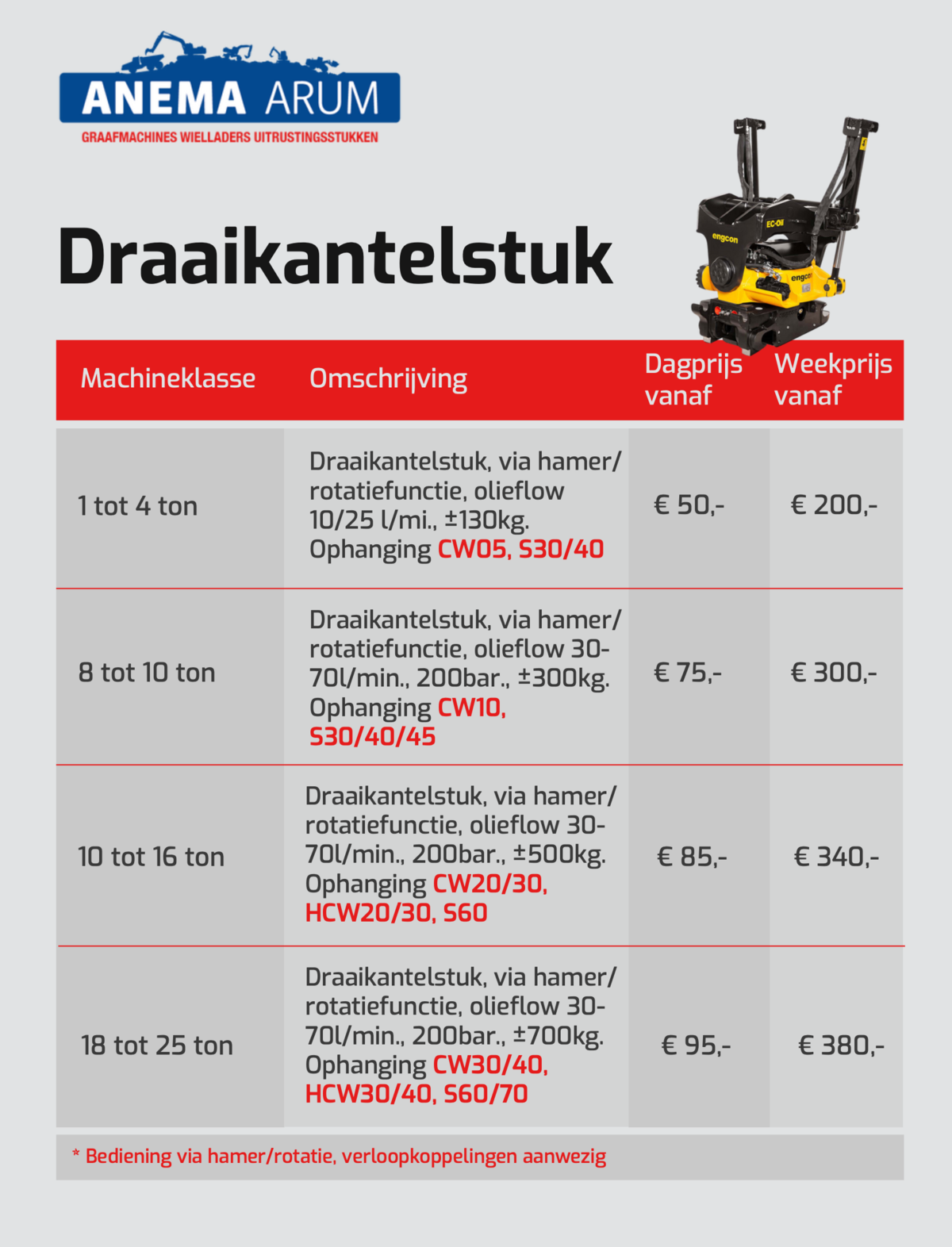 | 1 tot 4 ton | Draaikantelstuk, via hamer/ rotatiefunctie, olieflow 10/25 l/mi., ±130kg. Ophanging CW05, S30/40 |