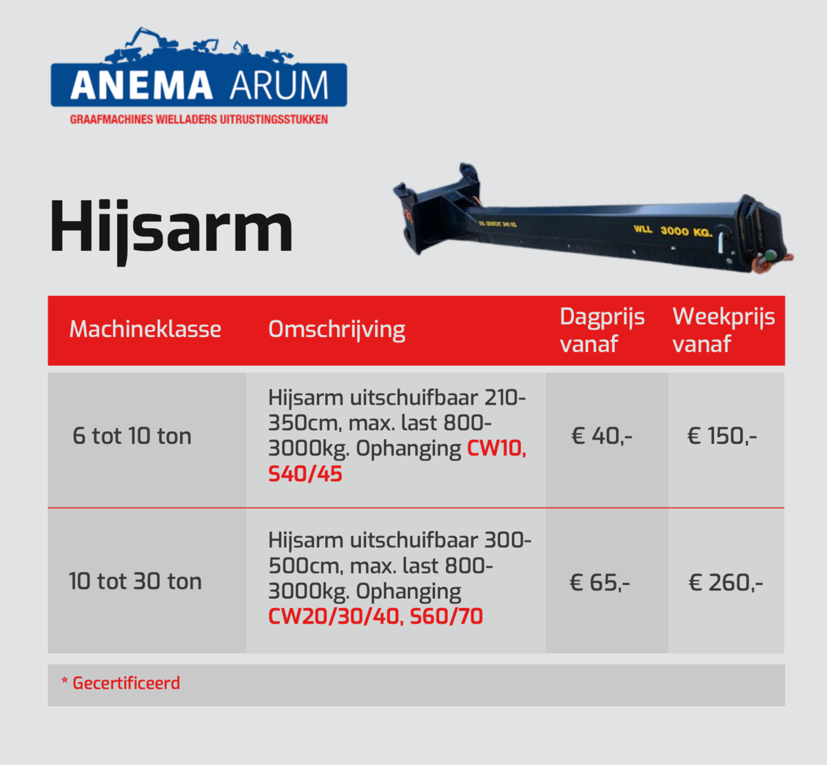 In de tabel hieronder en in de afbeeldingen kunt u de prijzen vinden voor hijsarmen die wij in onze verhuur hebben. Door de PDF hieronder te downloaden kunt u de huurprijzen van al onze uitrustingsstukken bekijken. Klik hier voor onze algemene verhuurvoorwaarden. Neem voor meer informatie contact met ons op via 0517 - 641329 of mail naar verhuur@anemabv.nl.