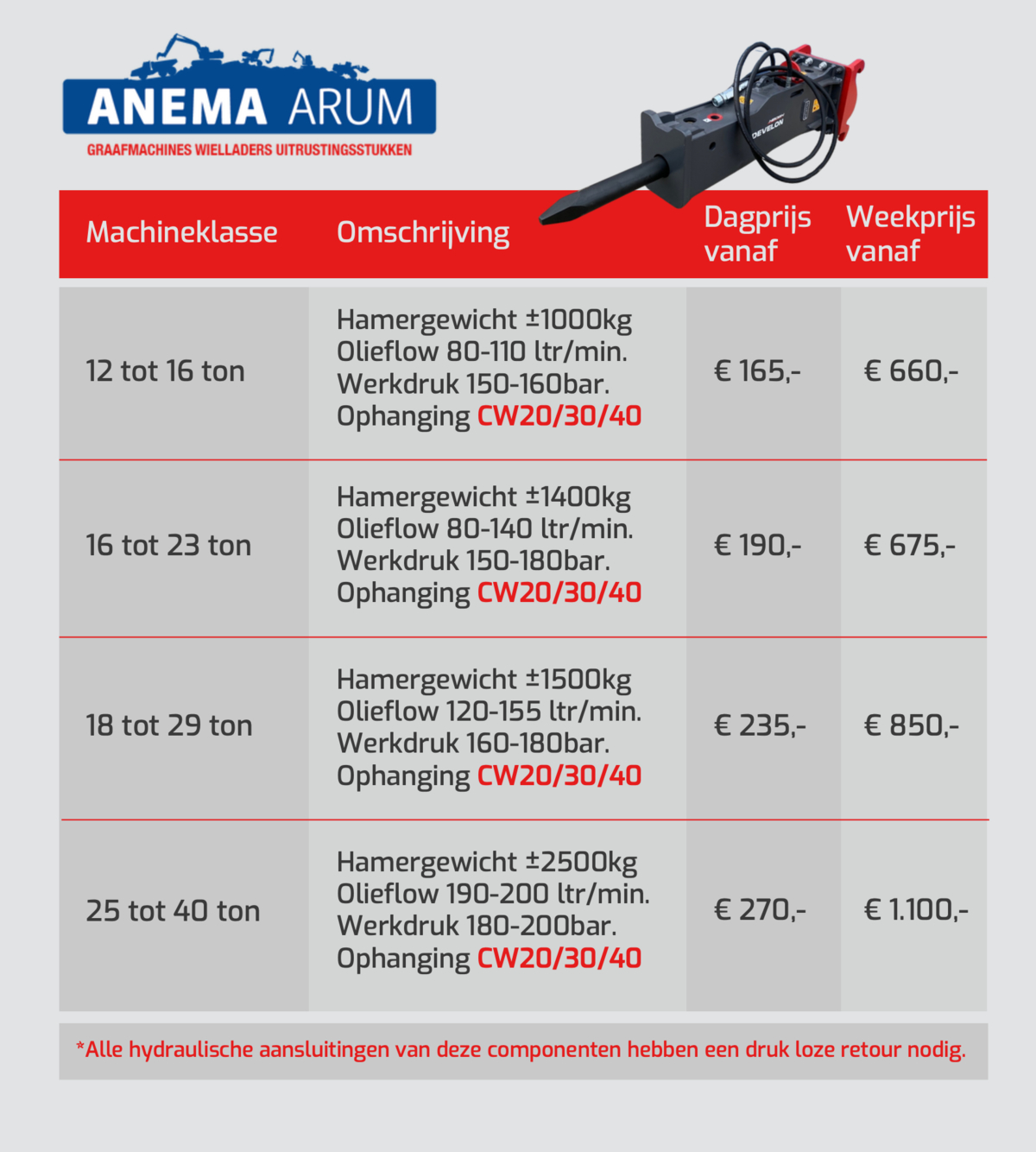 In de tabel hieronder en in de afbeeldingen kunt u de prijzen vinden voor sloophamers die wij in onze verhuur hebben. Door de PDF hieronder te downloaden kunt u de huurprijzen van al onze uitrustingsstukken bekijken. Klik hier voor onze algemene verhuurvoorwaarden. Neem voor meer informatie contact met ons op via 0517 - 641329 of mail naar verhuur@anemabv.nl.