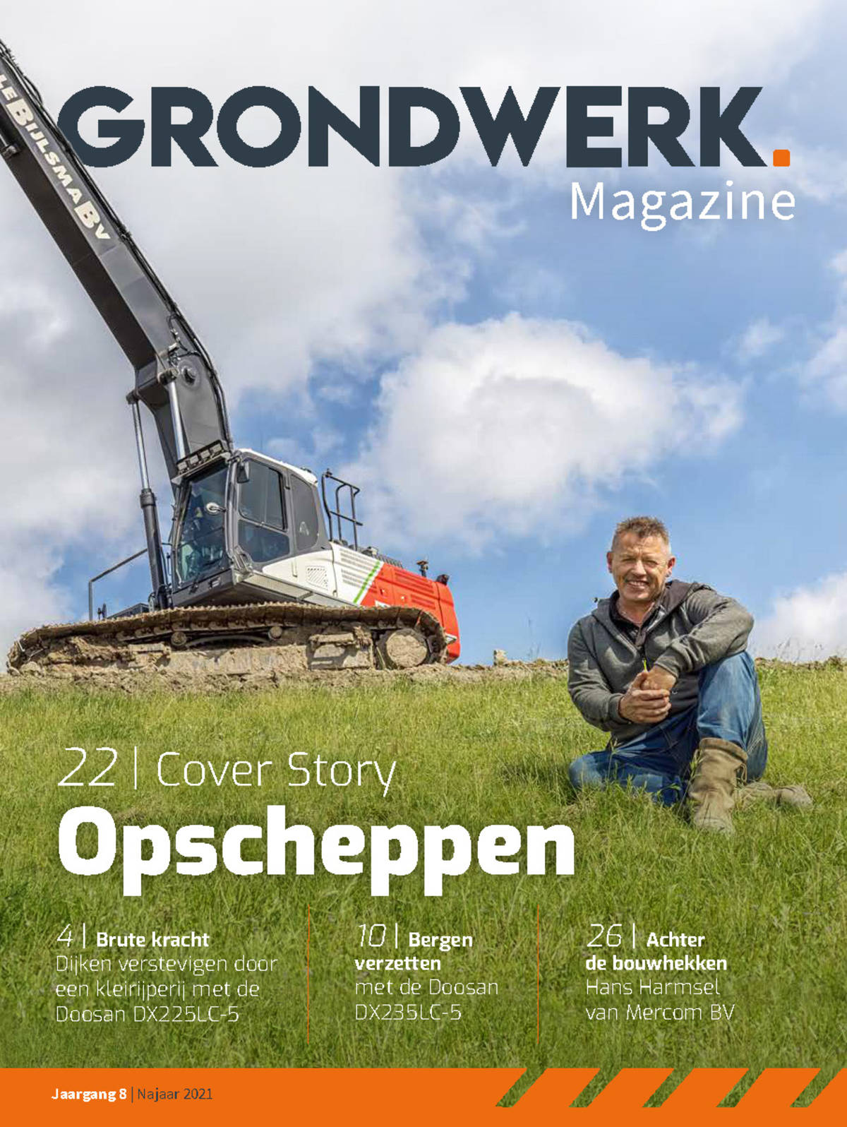 In de vaste rubriek 'Opscheppen' op pagina 22 en 23  is de redactie van het Grondwerk in gesprek met Frank Bijlsma, technisch directeur bij Jelle Bijlsma Giekerk. Het jubilerende bedrijf had vorig jaar de Europese primeur met de DX300LC-7 SLR van de nieuwste generatie rupsgraafmachines.