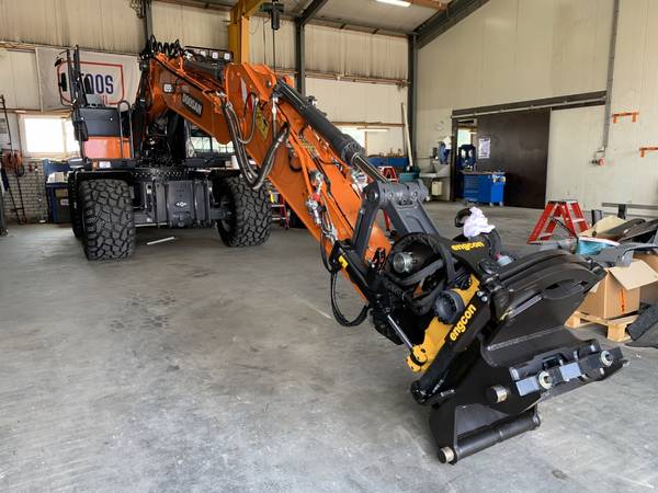 Een mobiele graafmachine welke volledig naar wens van de klant is opgebouwd en is uitgerust met onder andere een Engcon draai-kantelstuk.