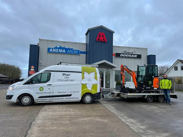 Na jarenlang bij Anema Arum tussen de Doosan graafmachines en wielladers te hebben gestraat, geschoffeld en het onderhoud te hebben gedaan, staat er vanaf nu een nieuwe Doosan DX19 op de trailer van Pier de Hovenier.