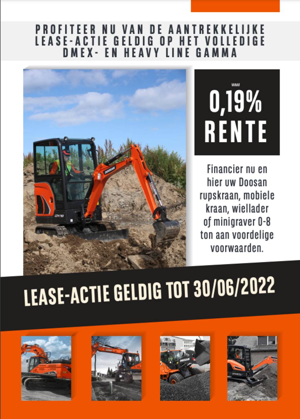 Wanneer u vóór 1 juli 2022 een nieuwe Doosan rups- of mobiele graafmachine, wiellader of minigraver aanschaft kunt u bij ons profiteren van een financiering vanaf 0,19%. Tarieven zijn afhankelijk van looptijd en aanbetaling.