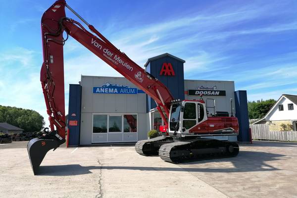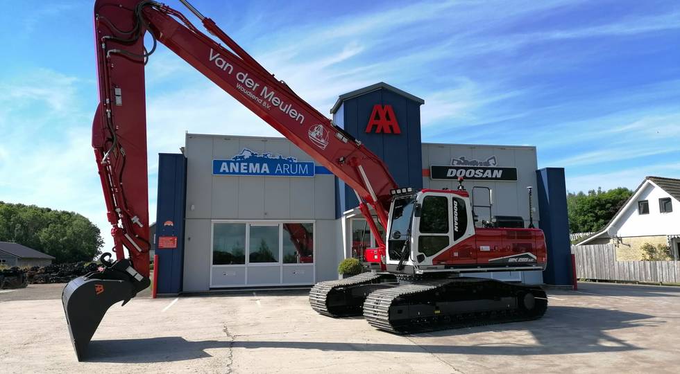 Afgelopen januari heeft van der Meulen Woudsend de eerste van de twee nieuw aangekochte Doosan rupsgraafmachines in gebruik genomen. Een Doosan DX300LC-7 multi-user, volledig aangepast naar wens van de klant en in bedrijfskleuren gespoten.
