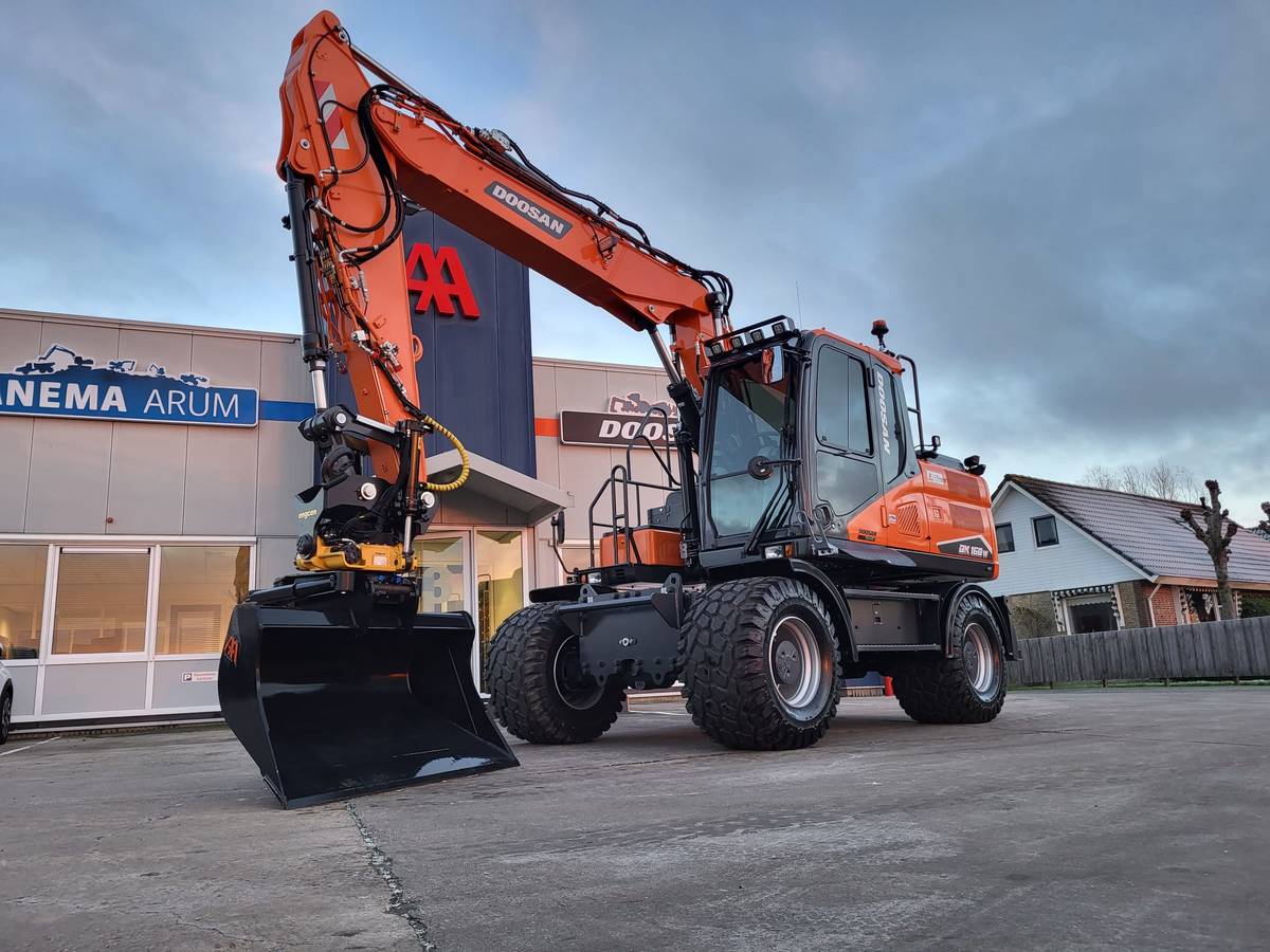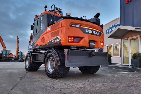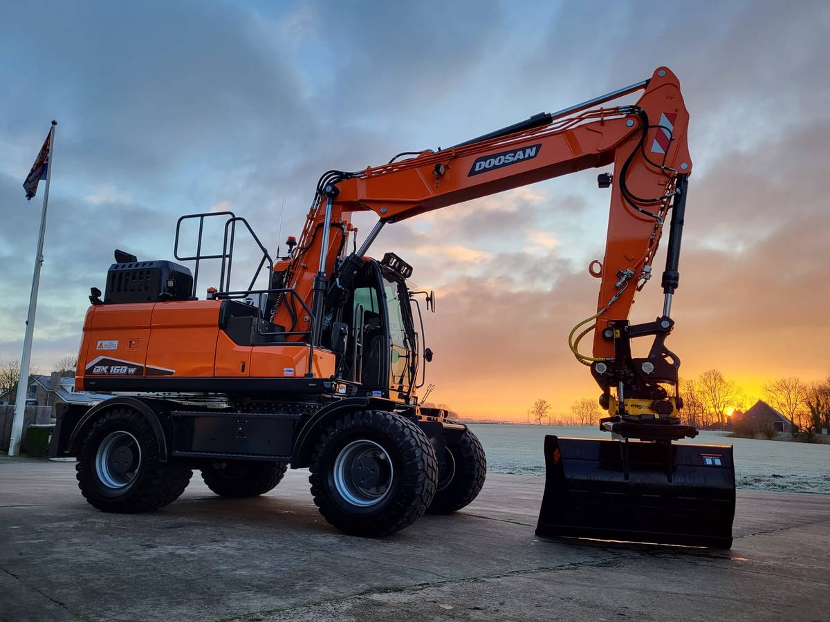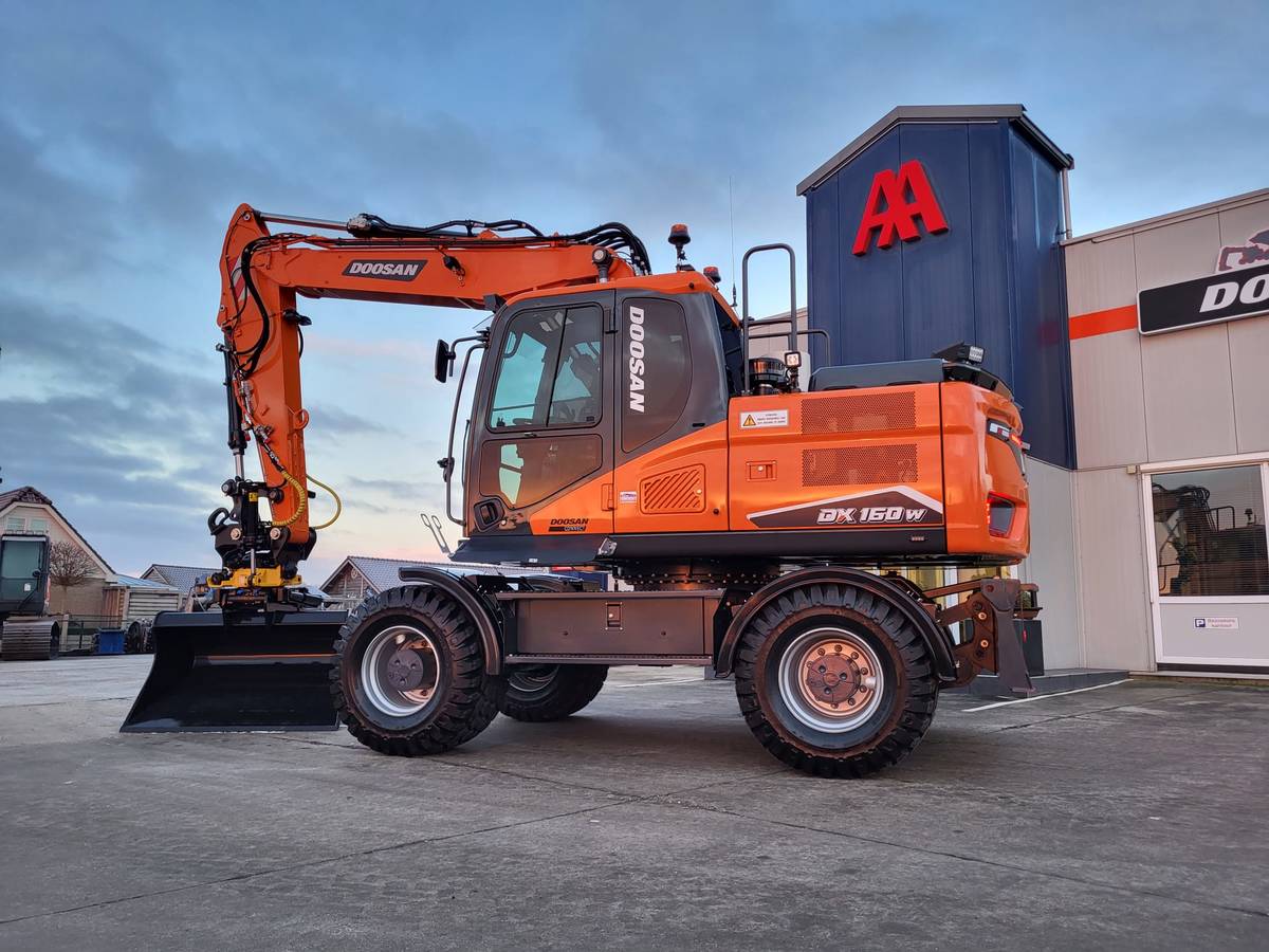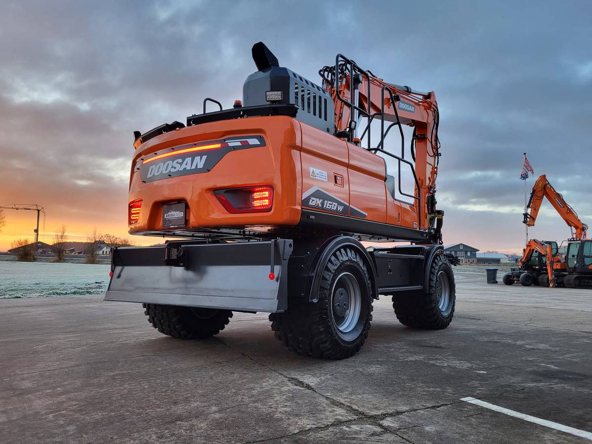 Tijd voor verzwaring van het materieel met de aankoop van deze speciaal opgebouwde nieuwe Doosan DX160W-7 welke een Hitachi ZX140W-3 vervangt.