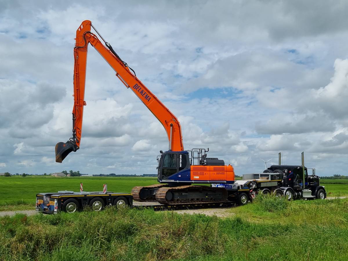 - Kenmerken: Opgebouwd met extra contragewicht ±3500kg naar een totaal eigen gewicht ±36000kg waarmee deze machine met gemak een 1250ltr graafbak kan bedienen op bereik van 18mtr. Met de opbouw van een hydraulische snelwissel CW40HD is eenvoudig te wisselen van een graafbak naar bijv. een baggergrijper. Voor het bedienen van een grijper is een extra hamerfunctie opgebouwd incl. lekleiding naast de standaard rotatiefunctie. Een zwaardere bakcilinder met einddemping zorgt voor meer kracht en soepeler bediening. Mede omdat de machine is voorbereid voor 3D-GPS van Topcon zijn er aan beide zijkanten treeplanken gemonteerd om eenvoudig de GPS antennes te (de)monteren. En al is de nieuwe Develon standaard al niet compleet genoeg, toch voorzien van opties als een kettingkist op onderwagen, bakcilinderomschakeling, automatische centrale vetsmering Groeneveld, getinte ramen en inbouw 27MC. Na de opbouw van alle opties is de DX300LC-7 SLR geheel opnieuw gespoten in de bedrijfskleuren van Beukema.