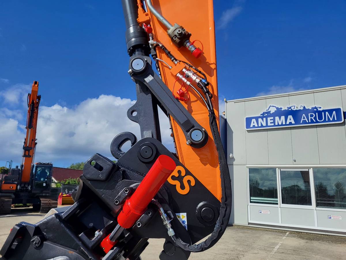 De graafmachine is verder aangepast met een verlengde lepelsteel van 4 meter, een hydraulische snelwissel CW40 met hijshaak, en een kantelstuk CW40HG-HD. De hamer- en rotatiefuncties zijn uitgerust met de benodigde koppelingen, en er is een stroomkabel aangebracht over de giek voor de aansturing van het draaikantelstuk. Verder is de machine voorzien van een kettingkist op de onderwagen, een afsplitsing op de lepelsteel voor kantelstukken, en een voorbereid overdruksysteem in de cabine. Klaas Bijlsma heeft gekozen voor extra ballast, waardoor het totale gewicht met 5500 kg is verhoogd, wat de stabiliteit van de machine ten goede komt.