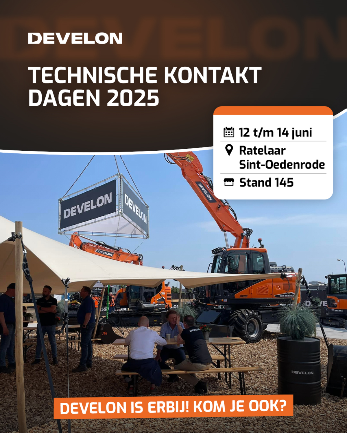 Samen met onze collega-importeur en Develon-dealers nodigen we je van harte uit op stand 145. Dit is dé kans om onze krachtige Develon-machines van dichtbij te bekijken én zelf uit te proberen.